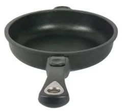 AMT Bratpfanne mittelhoch mit abnehmbarem Stiel. Besonders platzsparendes Aufbewahren und zum Überbacken im Ofen geeignet.