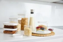 Das Wichtigste bei Vorrats- bzw. Schüttdosen ist der Verschluss. Der muss fest sitzen und gut zu öffnen sein – so wie der innovative Rastverschluss von Emsa Optima, der deutlich hörbar schließt. Selbst gefüllt lassen sich die Vorratsdosen so sicher anheben oder tragen. Einzigartig ist Optima auch in Punkto Hygiene: Deckel und Dichtung sind untrennbar miteinander verbunden, so dass es keine unerreichbaren Kanten gibt, in denen sich Keime oder Spülwasser ansammeln könnten. Weitere Pluspunkte sammelt Emsa Optima bei der Ordnung im Küchenschrank oder der Schublade. Dazu wurden die Vorratsdosen auf die Norm-Maße von Küchenmöbeln abgestimmt. Sie verschenken keinen Raum und lassen sich somit platzsparend nebeneinander oder dank Stapelkante auch rutschsicher übereinander verstauen. Und damit beim Kochen gleich die richtigen Zutaten zur Hand sind: Die transparenten Vorratsdosen mit Sichtfenster im Deckel zeigt auf einen Blick, was in ihnen steckt. Alle Dosen und Deckel sind natürlich spülmaschinenfest.