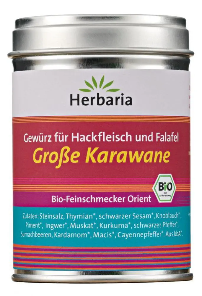 Herbaria Große Karawane ist ein Gewürzsalz für orientalische Hackfleischgerichte oder für vegetarische Varianten wie Falafel oder Bratlinge. Aber auch zu anderen orientalischen Gerichten passt sehr gut.