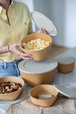 Bei der Reihe „organic bio-circular“ von koziol treffen entsorgtes Sonnenblumen- und Rapsöl aus Industrie und Gastronomie recycelt auf Holzfasern, die bei der Forstpflege und der Papierherstellung als Reste anfallen. Alle Hölzer stammen aus FSC®-zertifiziertem Anbau in Europa.