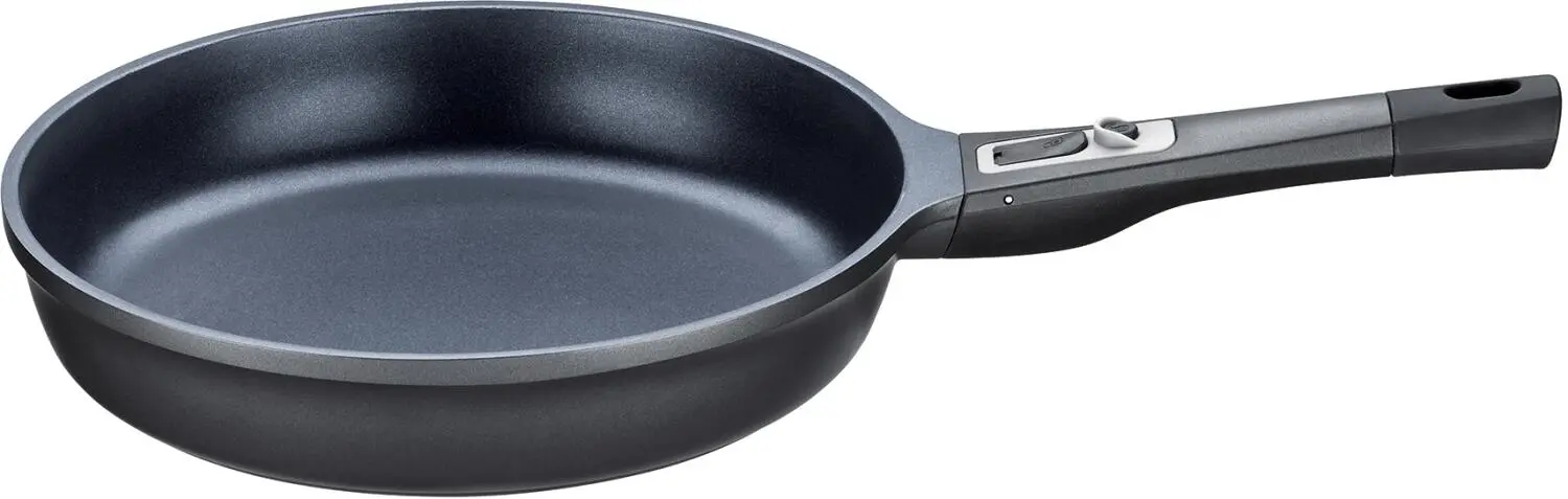 Küchenprofi Bratpfanne Milano. Breite Bratpfanne in drei verschiedenen Größen aus Aluminium-Guss mit induktivem Boden und abnehmbaren Griff.