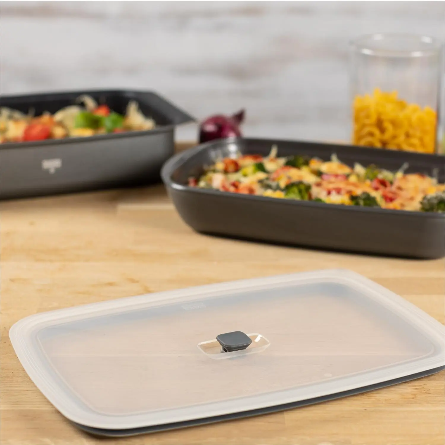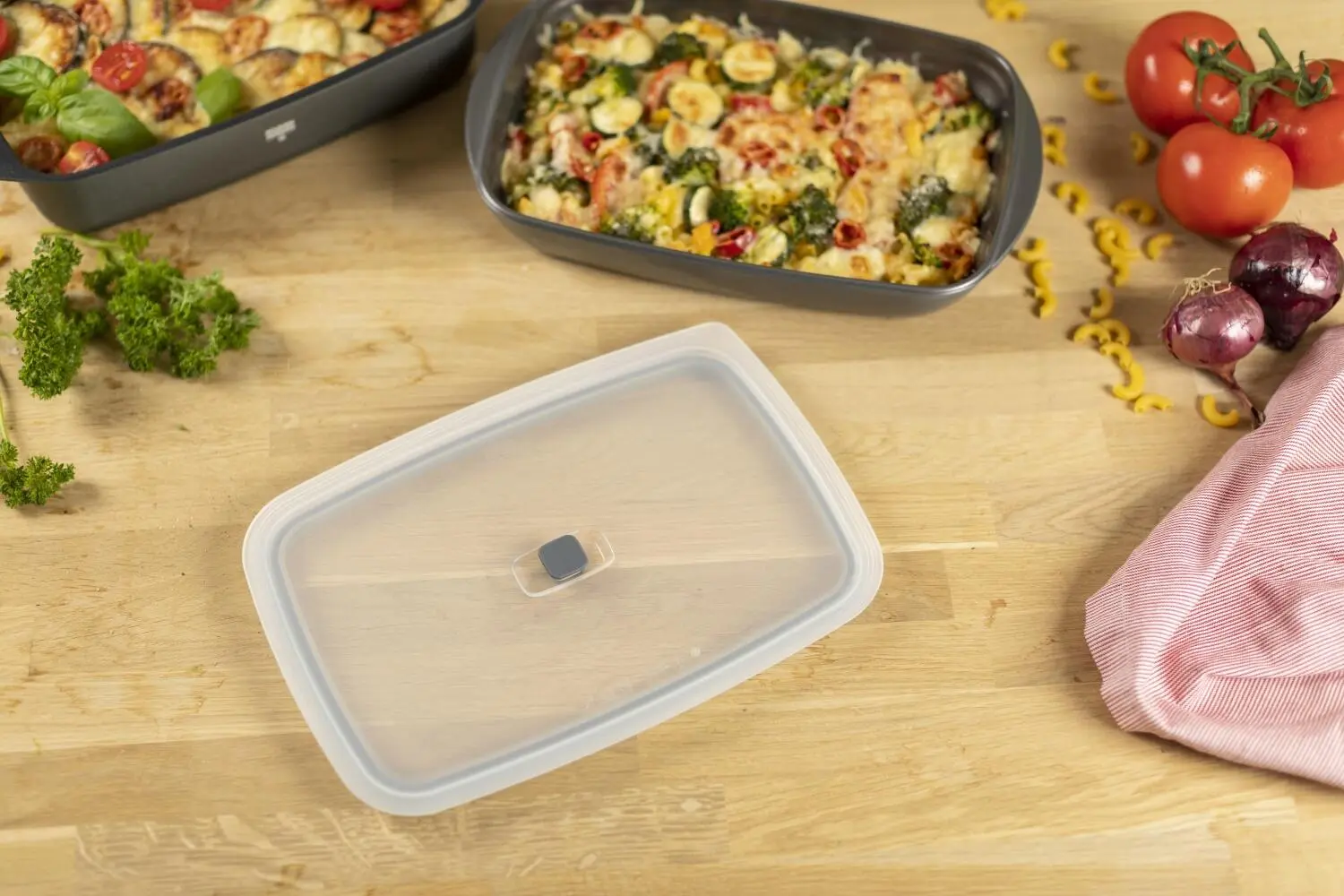 Kuhn Rikon können Sie Aufläufe schnell im Kühlschrank oder in der Gefriertruhe verstauen oder die Mahlzeit sogar mitnehmen! Dank des Ventils im Deckel kann Restwärme entweichen. Durch Runterdrücken entsteht ein leichtes Vakuum, welches Form und Deckel luftdicht miteinander verbindet.