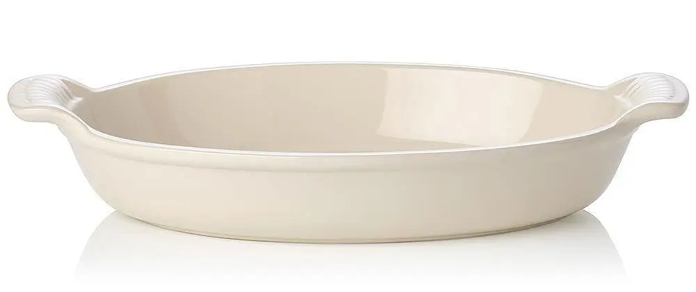 Le Creuset Auflaufform oval in creme. Die Poterie Auflaufform von Le Creuset ist optimal zum Gratinieren und Überbacken. In der Le Creuset Auflaufform wird der Teig gleichmäßig durchgebacken und von allen Seiten goldbraun und knusprig. Die praktischen Seitengriffe erleichtern die Handhabung.