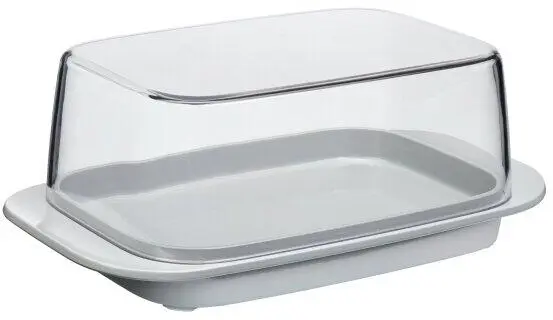 Mepal Butterdose in grau. Hygenisches Aufbewahren und Verschließen eines handelsüblichen 250 g-Pakets Butter.