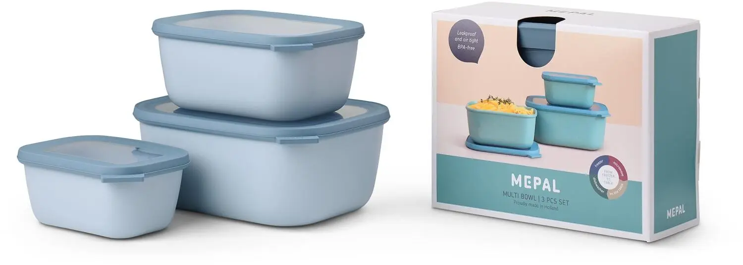 Mit diesem Mepal Multischüssel-Set Cirqula hast Du einen wahren Alleskönner im Haus. Speisen aufbewahren, einfrieren, aufwärmen und am Tisch servieren – alles in ein und derselben Schüssel. Die Schüsselgrößen in diesem Set sind: 750 ml, 1500 ml und 3000 ml.