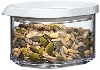 Vorratsdose Modula 175 ml, mit einem durchsichtigen Deckel mit weißem Rand. Diese kleine Dose mit abgerundeten Ecken hat ein Volumen von 175 ml und ermöglicht einen direkten Blick auf den Inhalt, sogar in der Küchenschublade!