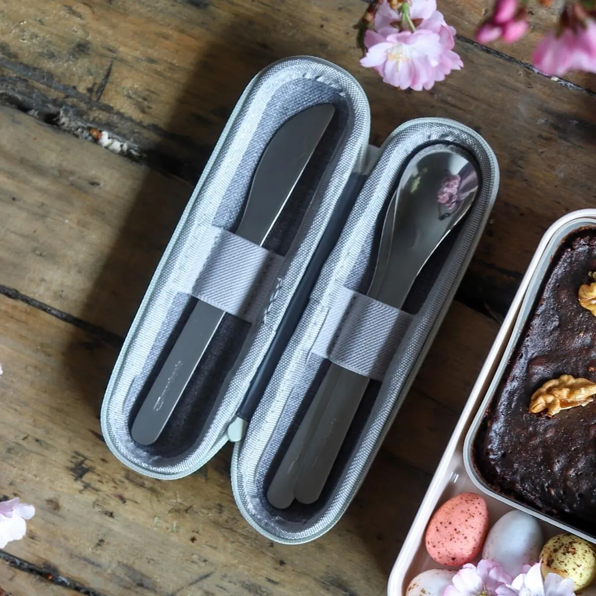 Monbento MB Slim Nest trio im Stoffetui. Das Besteck aus Edelstahl besteh aus Messer, Gabel und Löffel. Dank Etui aus Stoff inkl. Gummiband ist ideal für unterwegs!