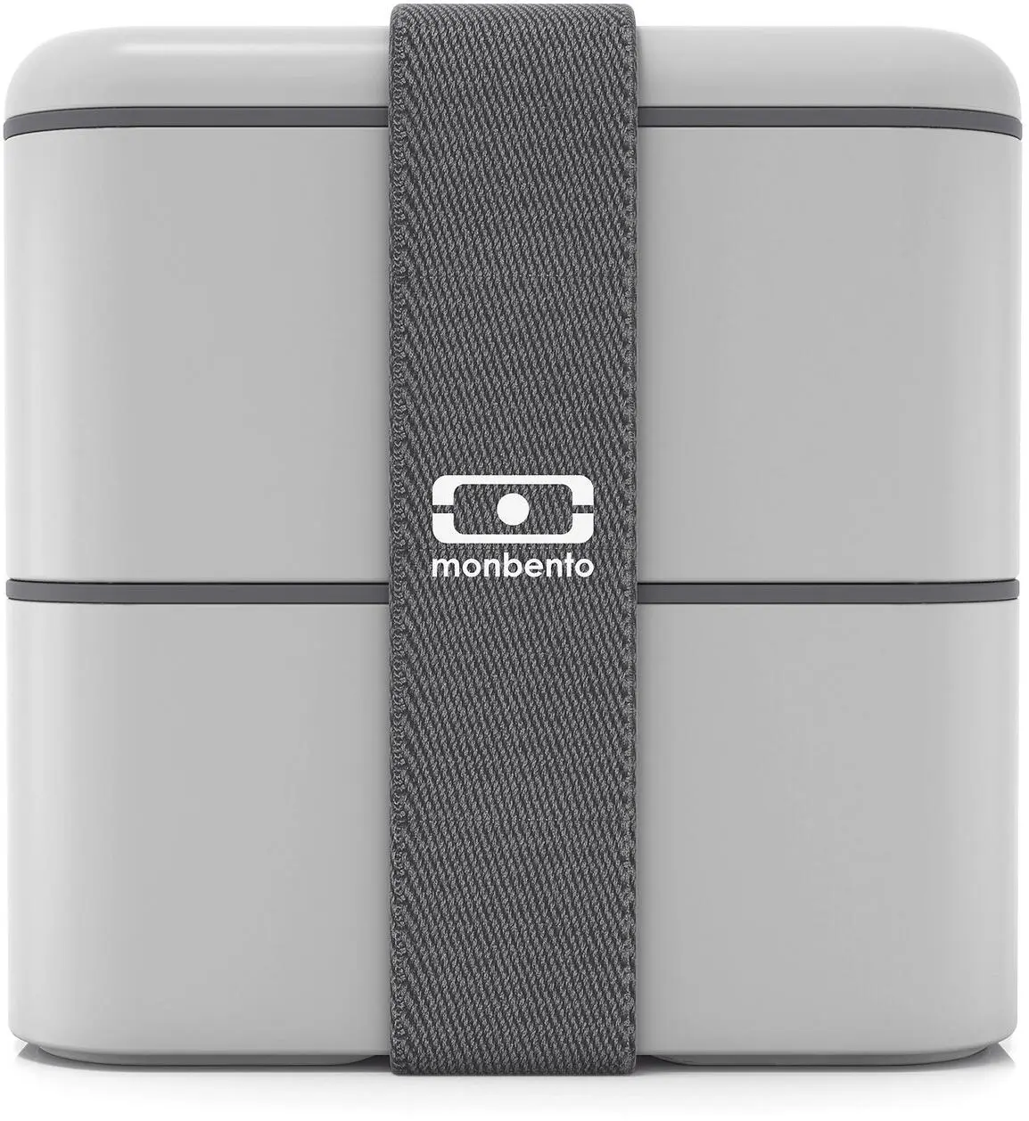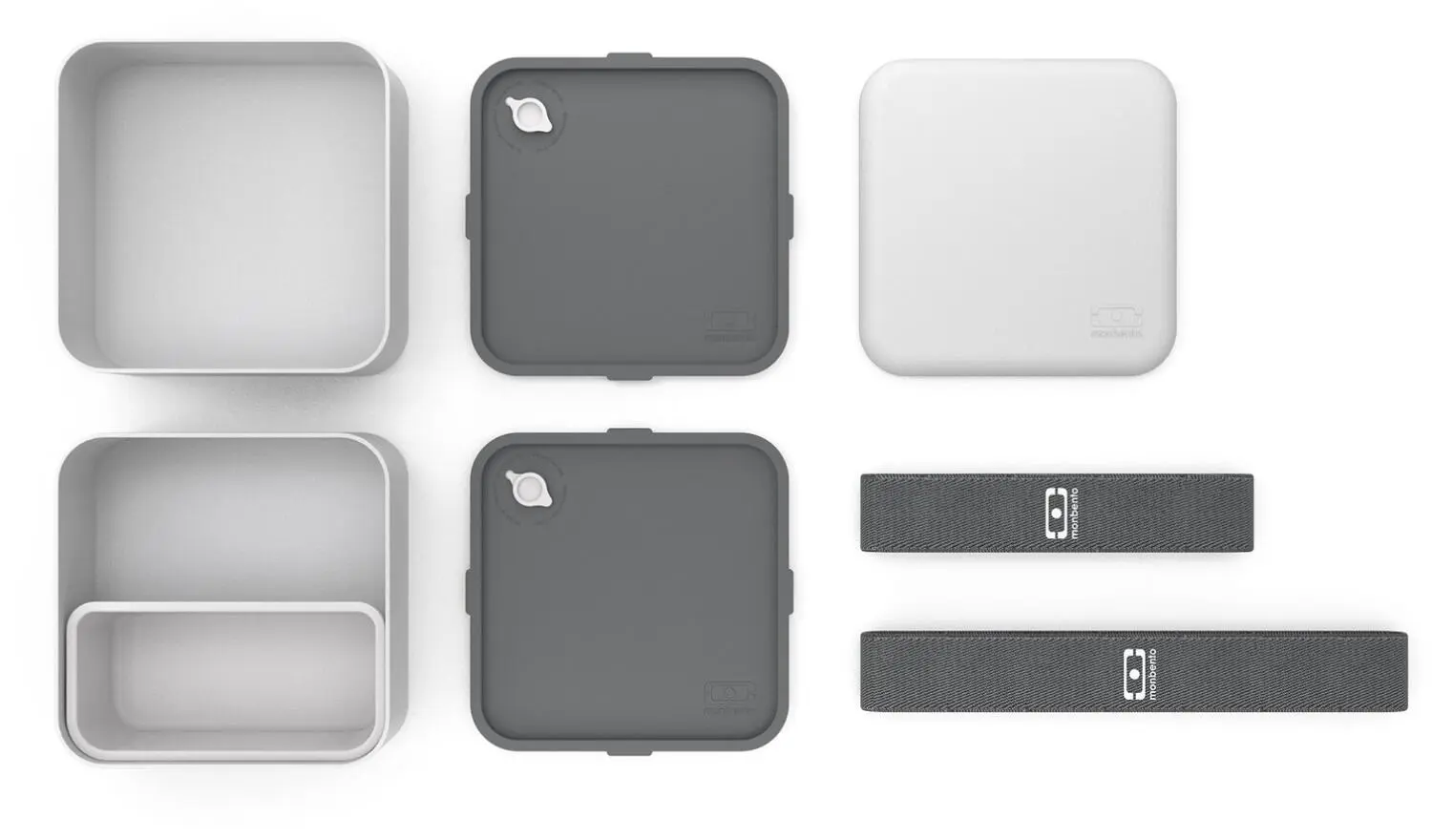 Monbento MB Square Bento-Box coton-grau, made in France. Moderne Lunchbox im quadratischen Design. Mit zwei separaten Fächern und Transportbändern. Ideal für Sandwichs und größere Portionen.