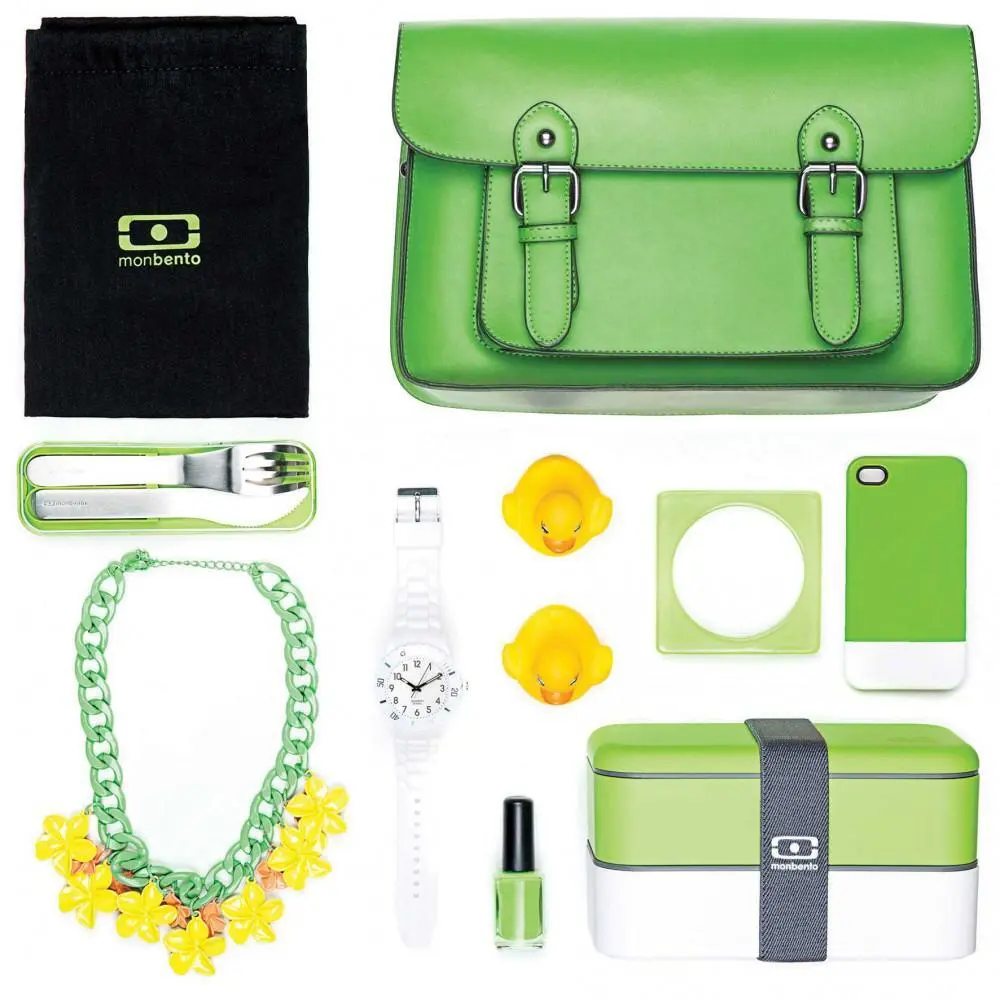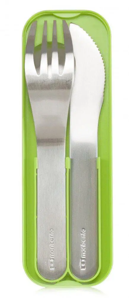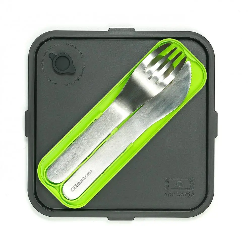 Besteck in grün. Das Edelstahl-Besteck mit Halterung kann zwischen den Ober- und Zwischendeckeln der MB Original und MB Square Bento-Box befestigt werden.