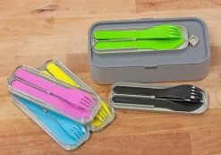 Das Monbento Pocket Besteck ist für das Mittagessen unterwegs geeignet, denn die farbige Halterung kann auf praktische Weise zwischen den Ober- und Zwischendeckeln der Monbento MB Original Bento-Boxen befestigt werden. Das Set besteht aus je einer Gabel, Löffel und Messer. Der Clou: Der Kunststoff ist biologisch abbaubar und somit besonders umweltfreundlich.