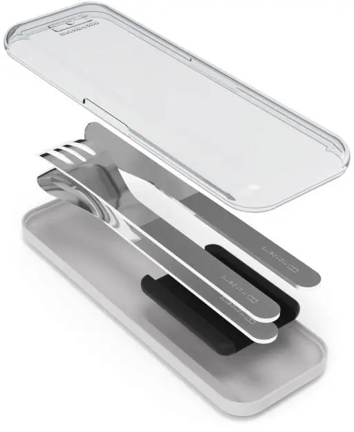 Monbento Slim Box Besteck in schwarz Onyx. Das Besteck aus Edelstahl mit PP-Halterung kann zwischen den Ober- und Zwischendeckeln der MB Original und MB Square Bento-Box befestigt werden. Kompakt, praktisch und ideal für unterwegs! Beim MB Square passt das Messer unten, der Löffel in der Mitte und die Gabel oben aufgelegt.