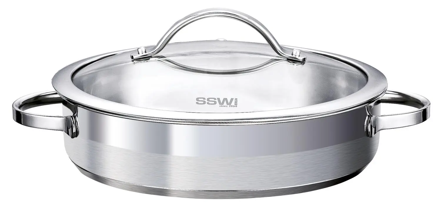 Der Glasdeckel mit Chromrand ist für energiesparendes und vitaminschonendes Braten und Garen prädestiniert.