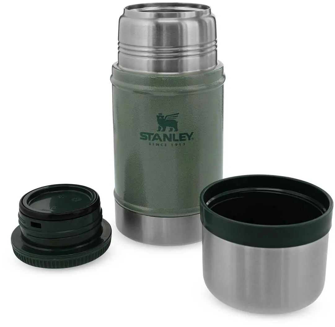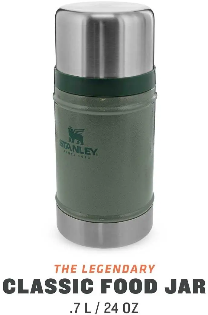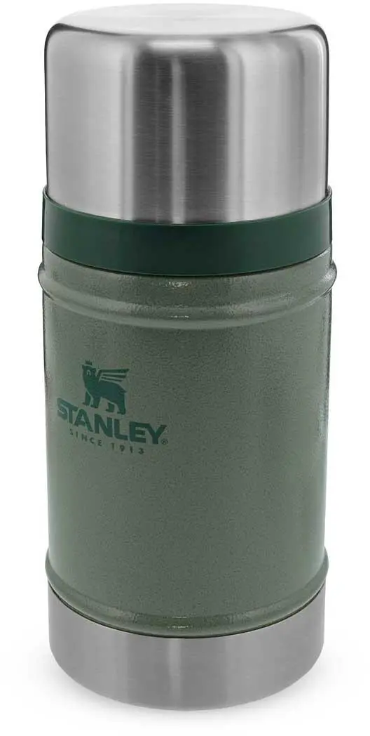 Der praktische Stanley CLASSIC FOOD CONTAINER ist ein toller Begleiter für unterwegs. Durch die große Öffnung mit 7 cm Durchmesser lassen sich sowohl kalte als auch warme Speisen bequem einfüllen. Auch die Reinigung des Containers geht leicht von der Hand. Der doppelwandige 18/8 Edelstahl-Container bietet eine gute Isolation und hält 0,7 Liter bis zu 15 Stunden heiß oder 18 Stunden kalt. Der Deckel hat ein Fassungsvermögen von 0,354 Liter und kann als Gefäß verwendet werden. Eine Lackierung in Hammerschlag-grün sorgt für eine ansprechende Optik.