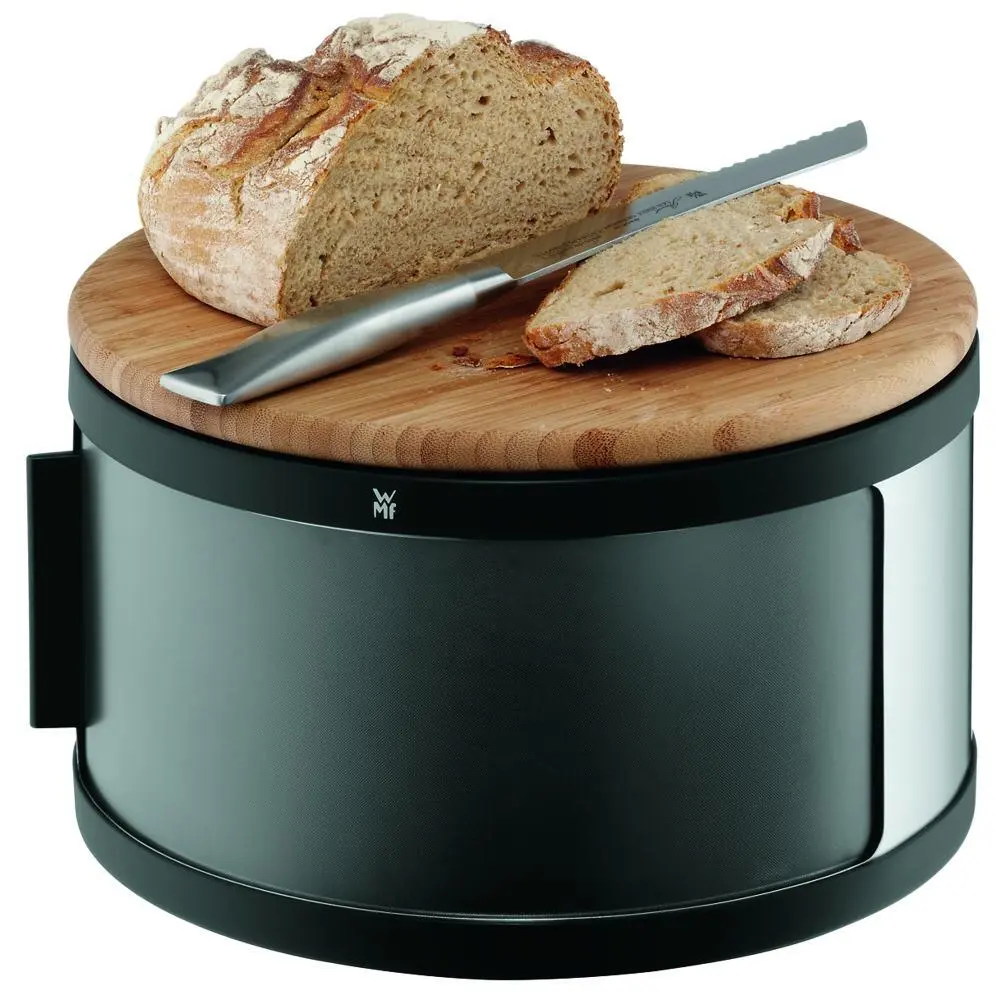 WMF Brottrommel Gourmet mit Schneidbrett. Brotkasten zur optimalen Aufbewahrung von Brot-und Backwaren. Sorgt die Brottrommel für das richtige Klima, nicht zu trocken, nicht zu feucht. Mit Schiebetür und einem abnehmbaren Bambus-Schneidbrett. Hinweis: Ohne Schneidbrett sind mehrere Trommeln übereinander stapelbar. Für getrennte Aufbewahrung von Brot, Brötchen und Backwaren.